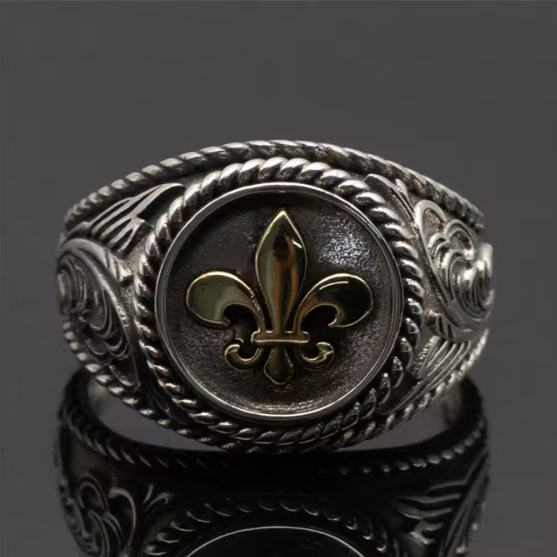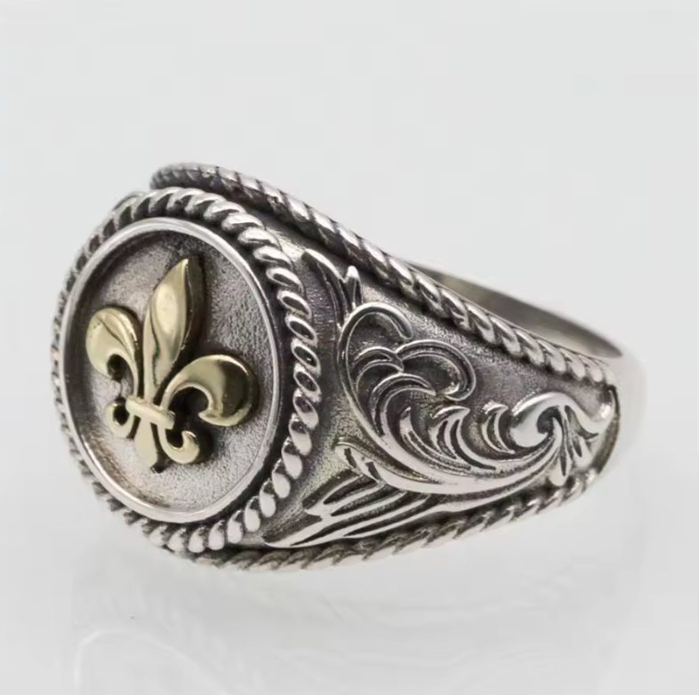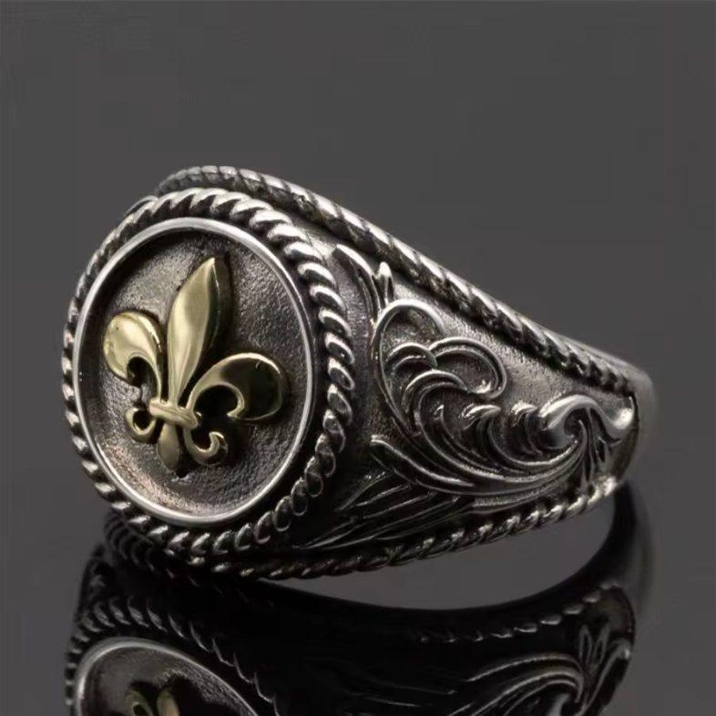 Forgée à la main avec un soin exceptionnel, cette chevalière en acier de haute qualité porte fièrement la Fleur de Lys, symbole immémorial de la France, de sa royauté et de son identité. Emblème de pureté et de courage, elle rappelle la mission sacrée de Jeanne d’Arc, qui fit broder la Fleur de Lys sur son étendard pour guider la France vers sa renaissance.